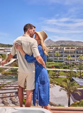 Eine Suite über zwei Etagen mit zwei Außenbereichen: Ein Balkon zum Sonnenbaden und eine großzügige Dachterrasse mit Bali-Daybed und Panoramablick. Das ansprechende Interieur verbindet eine moderne Einrichtung mit mediterranem Ambiente. Hier können Sie Ihre Liebe in Ihrem eigenen Rhythmus feiern.